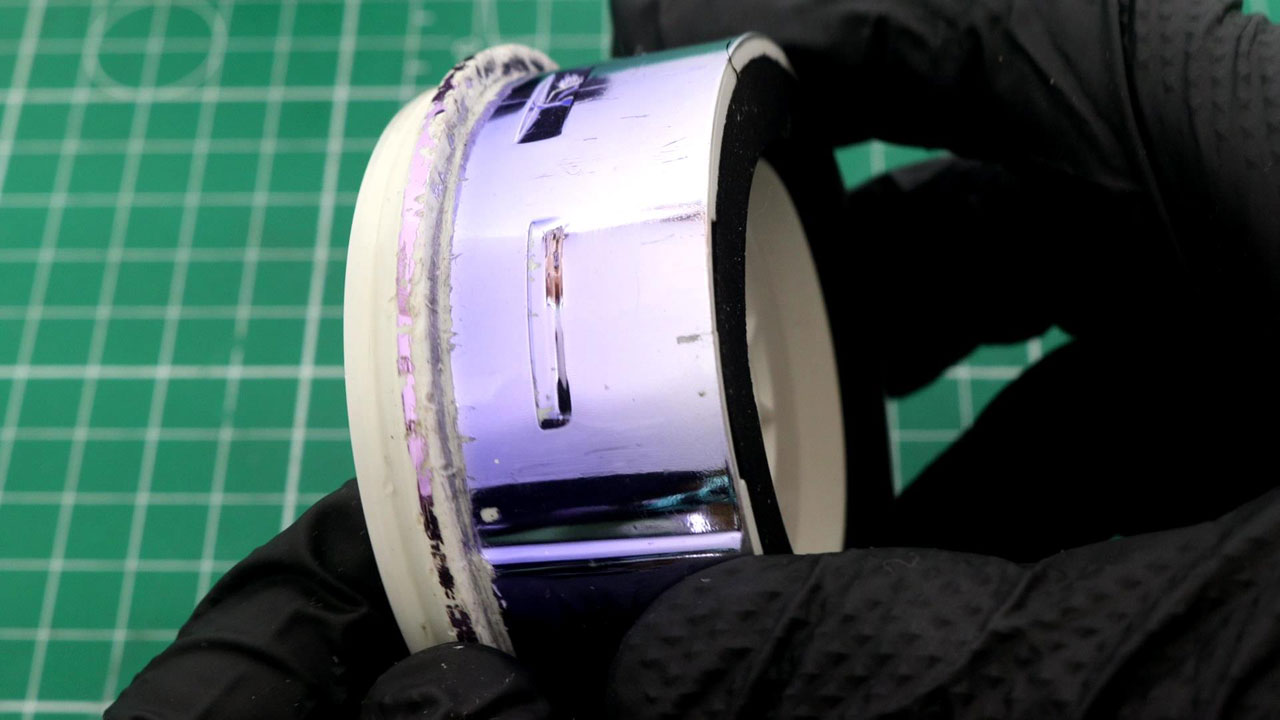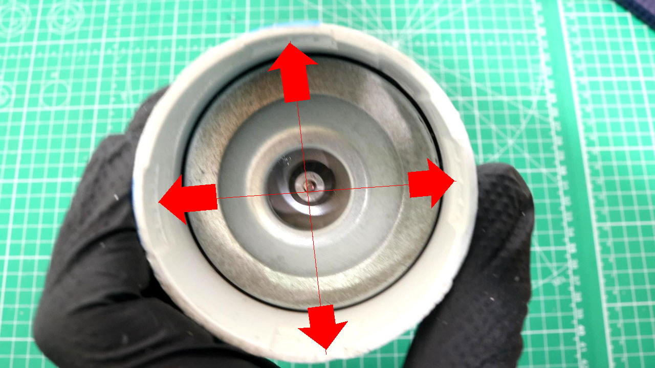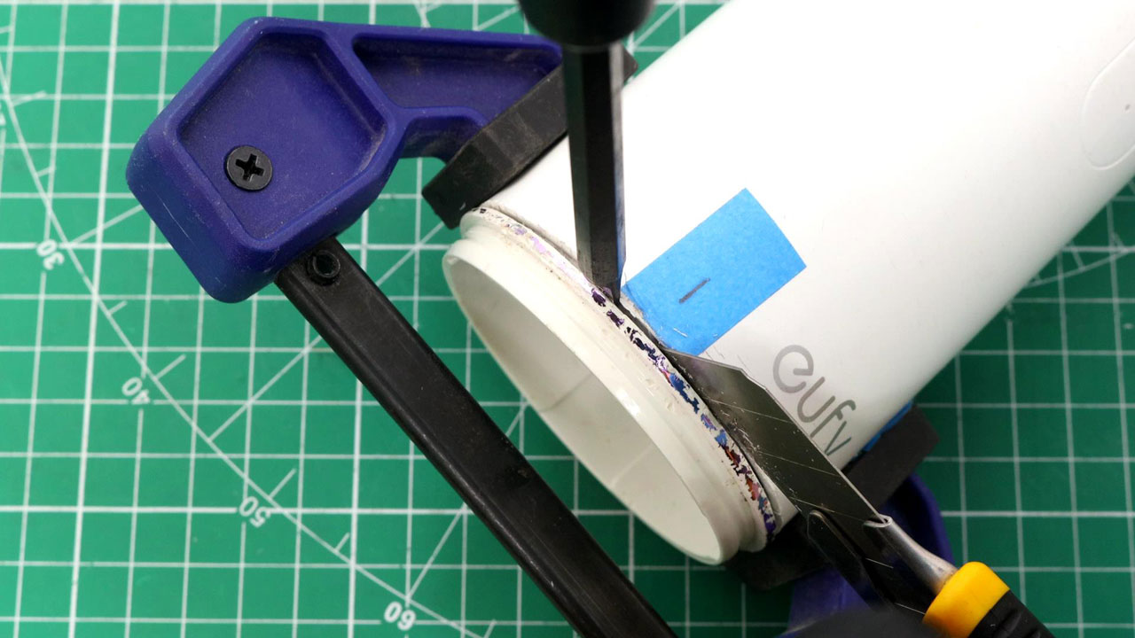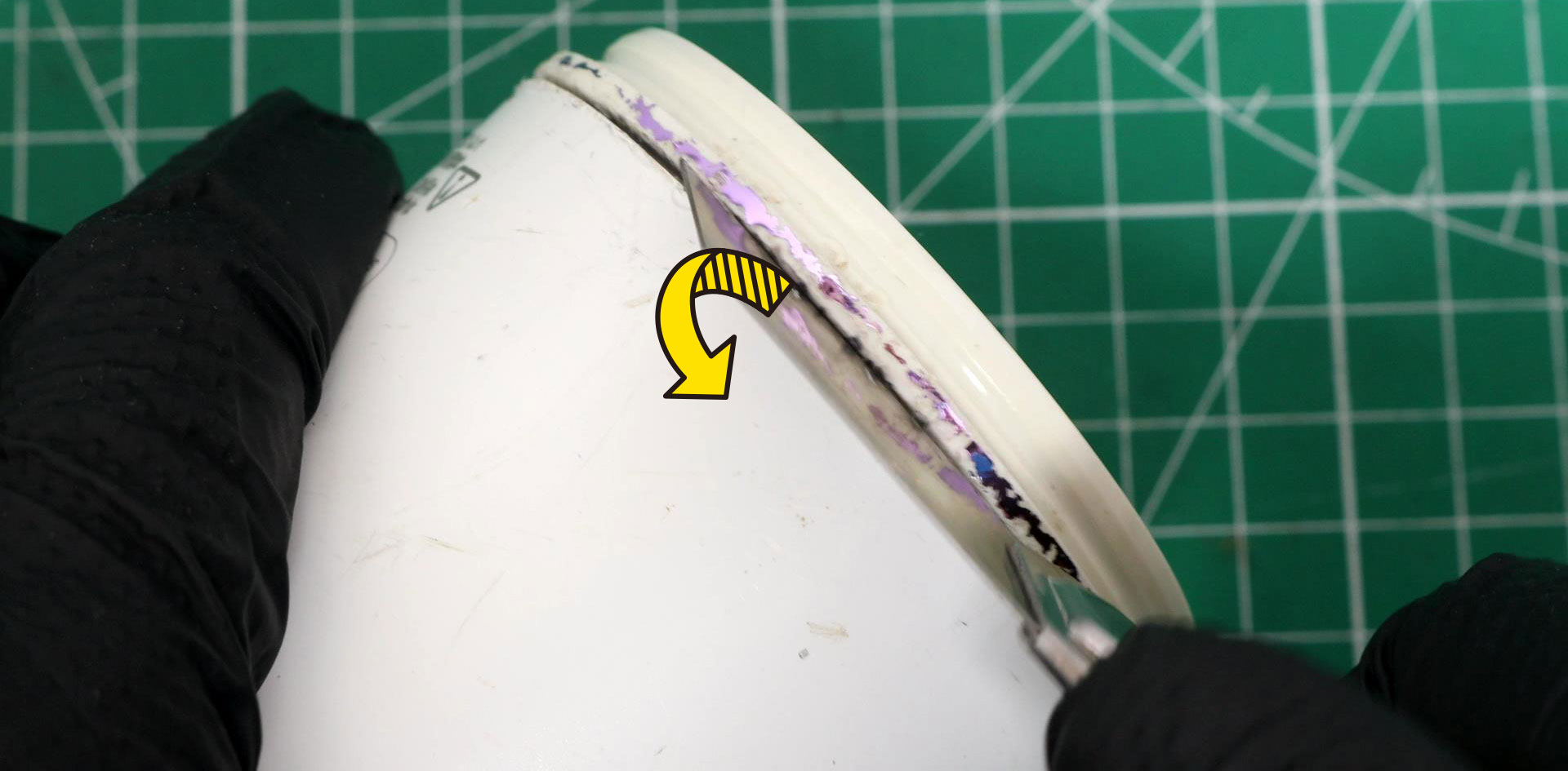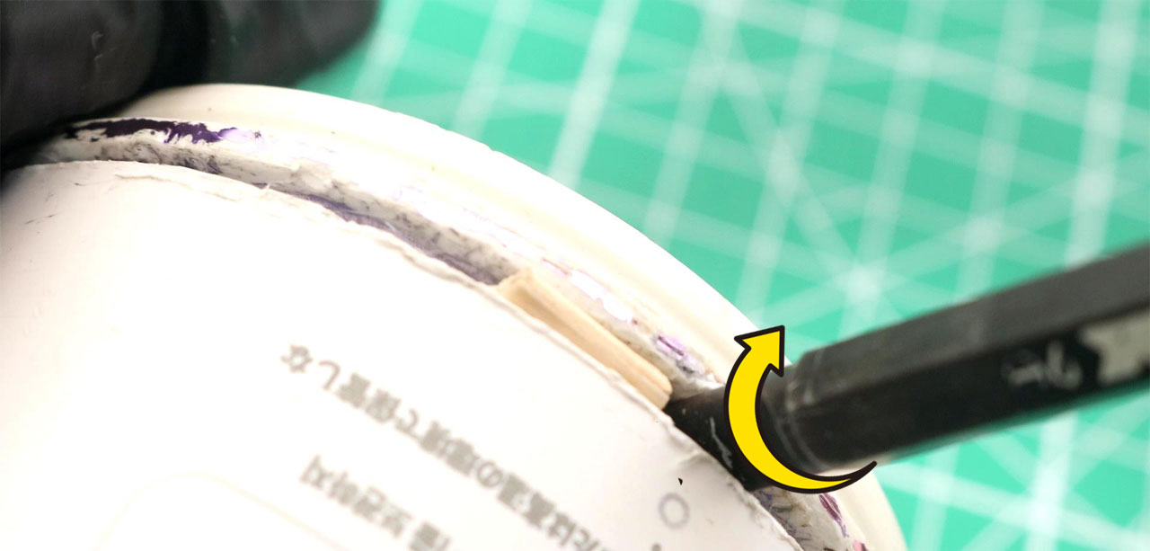 継ぎ目にわずかな隙間ができたら、そこにカッターの刃を差し込み、刃を本体側に倒すようにしながら、少しずつこじっていきます。一気に刃を深く傾けるのではなく、角度を浅く傾けながら継ぎ目に沿って外周全体を何度か回し、全体に均一な遊びが出てきた段階で、刃を倒す角度を徐々に強めていきます。