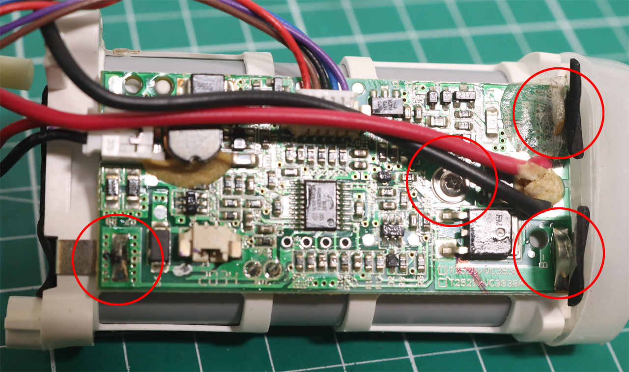 メイン回路基板は1本のネジで固定され、2つのピンコネクタ、電池端子に溶接されたニッケルストリップによって接続されているので、素人が電池交換するのは困難です。
