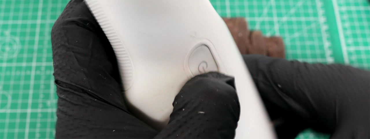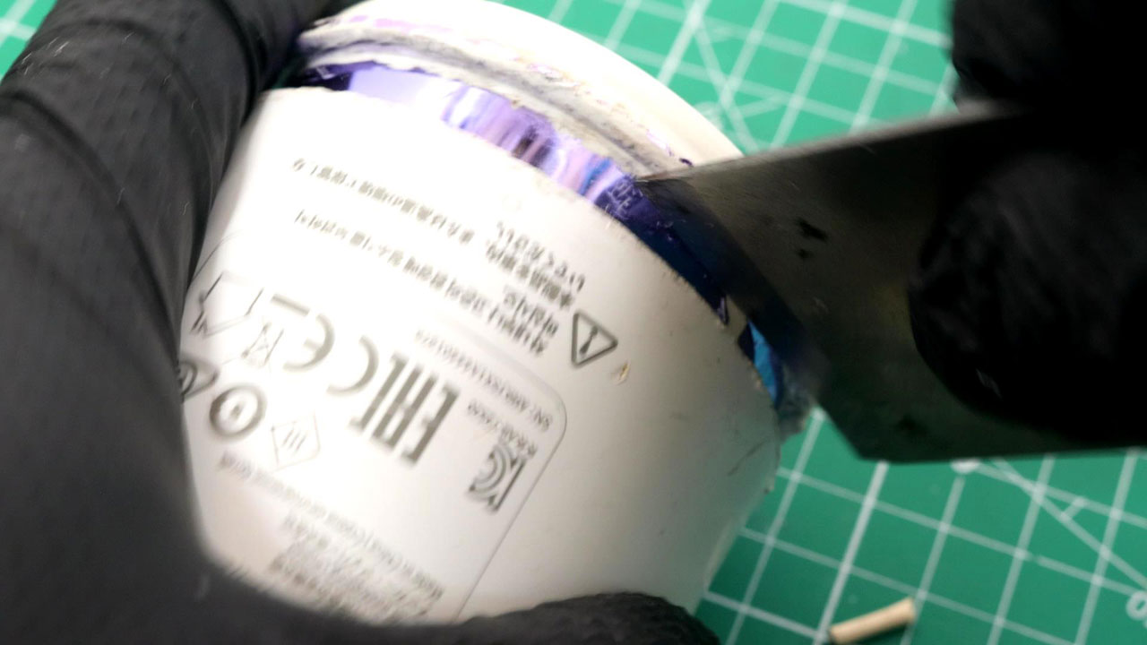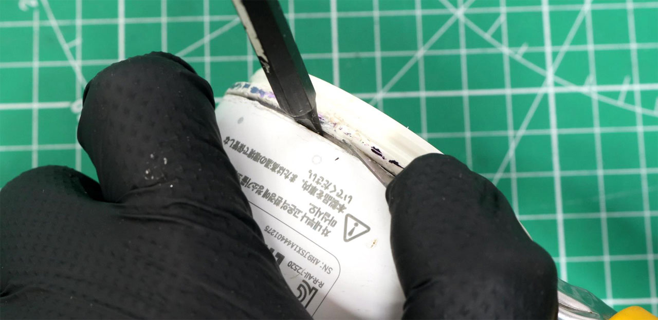 そのため、メインカバーをこじ開ける隙間を広げるため、まず最初に継ぎ目に沿って中型~大型タイプのカッターの刃を少しずつ入れていきます。この作業を5分ほど繰り返していると、継ぎ目に0.5mmの隙間が開きます。