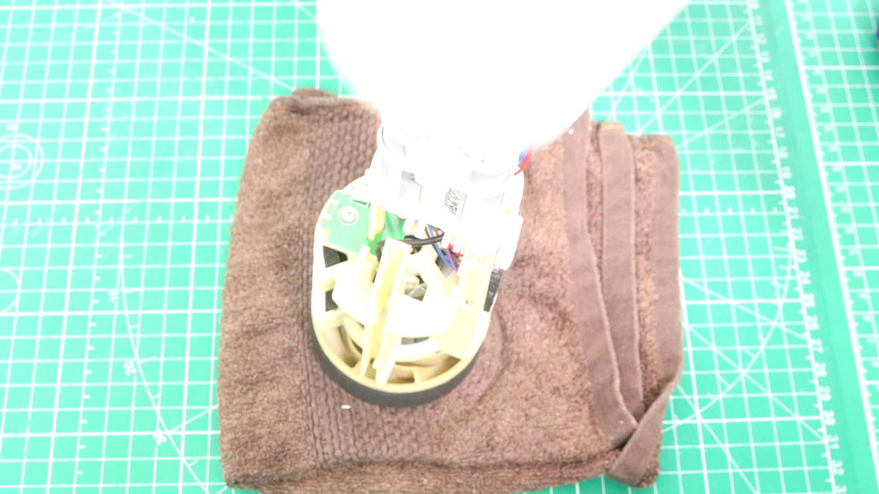 モーターハウジング側に固定されている内部ユニットは、スイッチの前側を強く押し、床に軽く叩きつけると簡単に取り出せます。このときに内部ユニットが床にぶつかり強い衝撃が加わるため、クッションになるものを敷いたほうがよいでしょう。